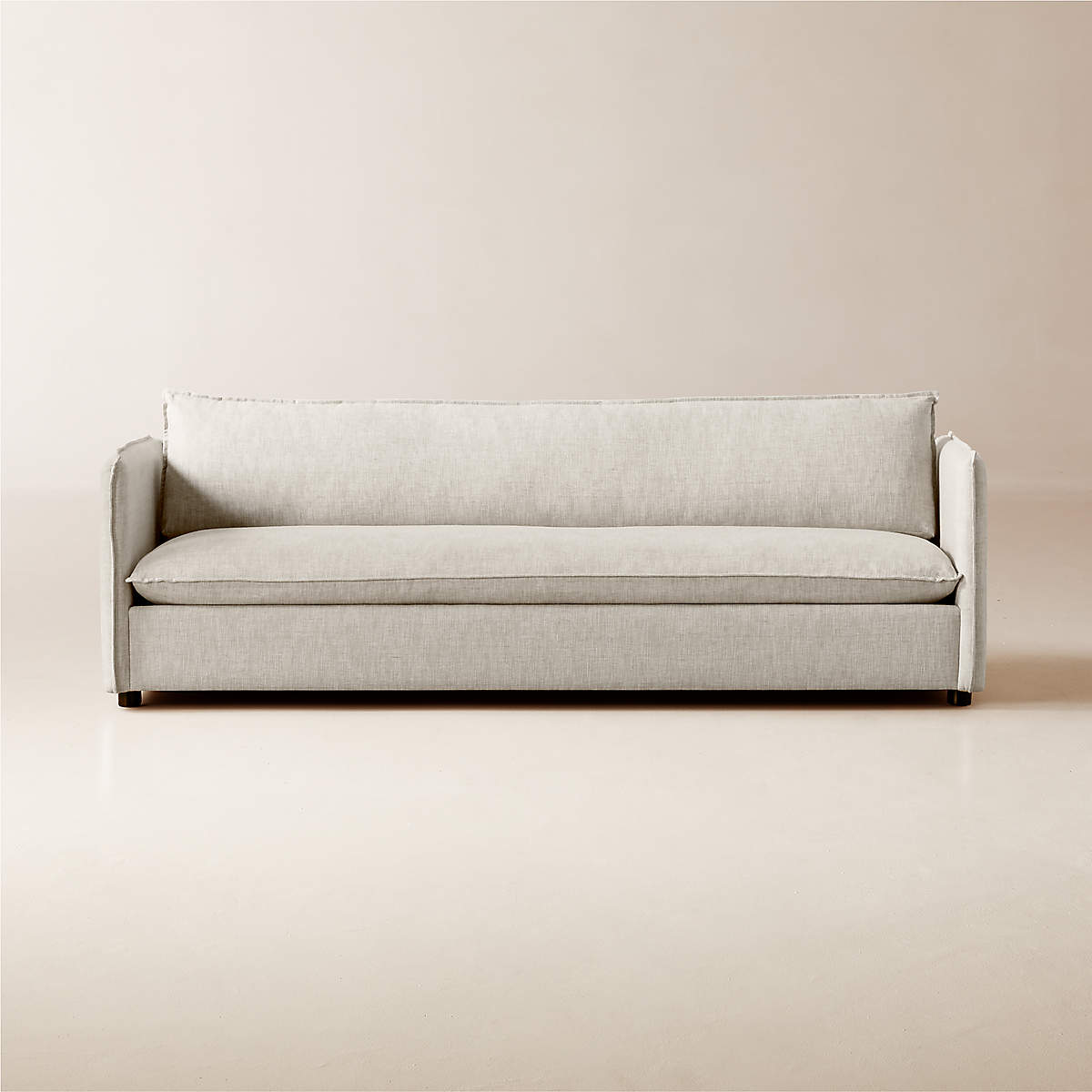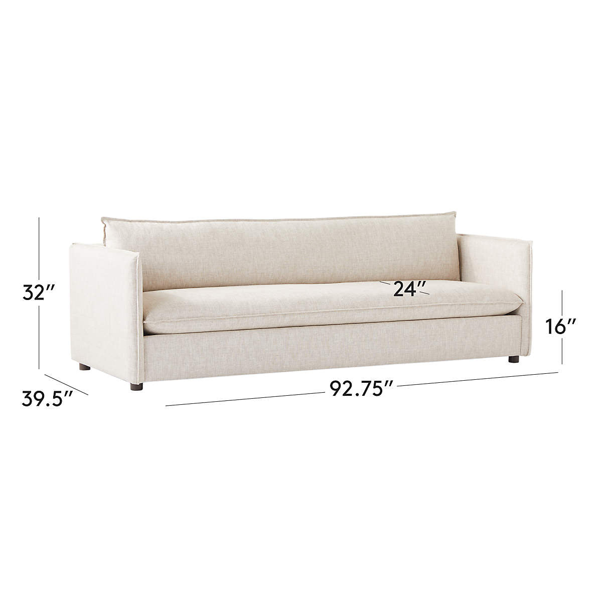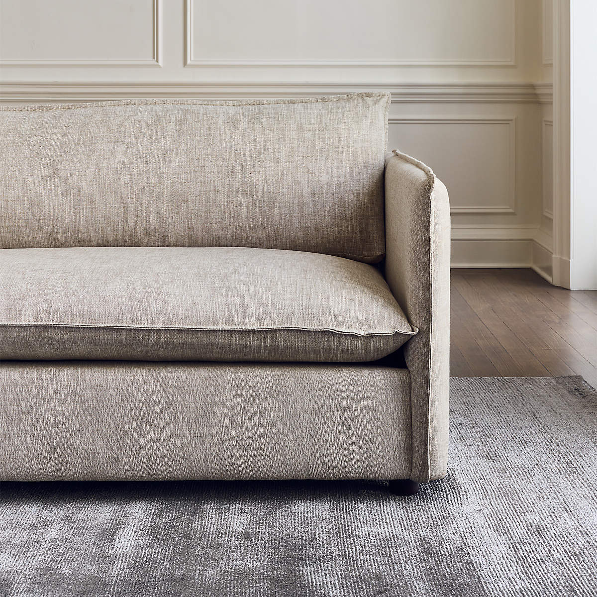 Built on a thin frame, Italian-inspired sofa brings a sense of lightness to smaller spaces. Transitioning easily between formal and informal settings, the sofa's slim silhouette and seamless armrests offer a modern aesthetic, while flange-trimmed linen upholstery in a tonal neutral nods to more traditional influences. CB2 exclusive.