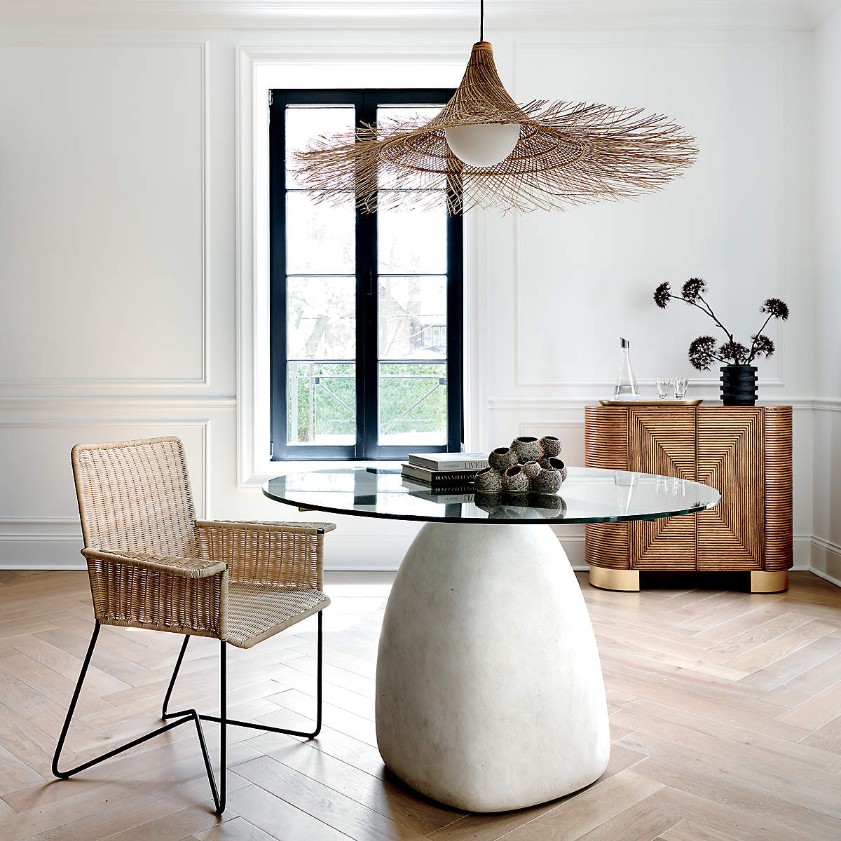 Vintage-inspired piece layers stone, brass and glass in an everyday dining table that is anything but ordinary. The Caleb Zipperer design is set on an organic-shaped stone/cement base with natural ivory tones. Four brass-plated arms extend out in large X to support a thick glass top. Table is made for four.